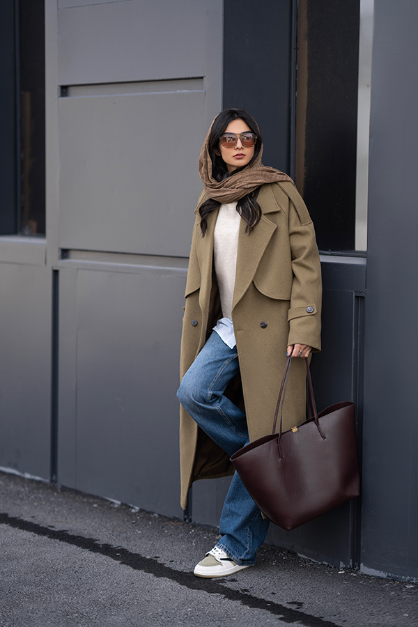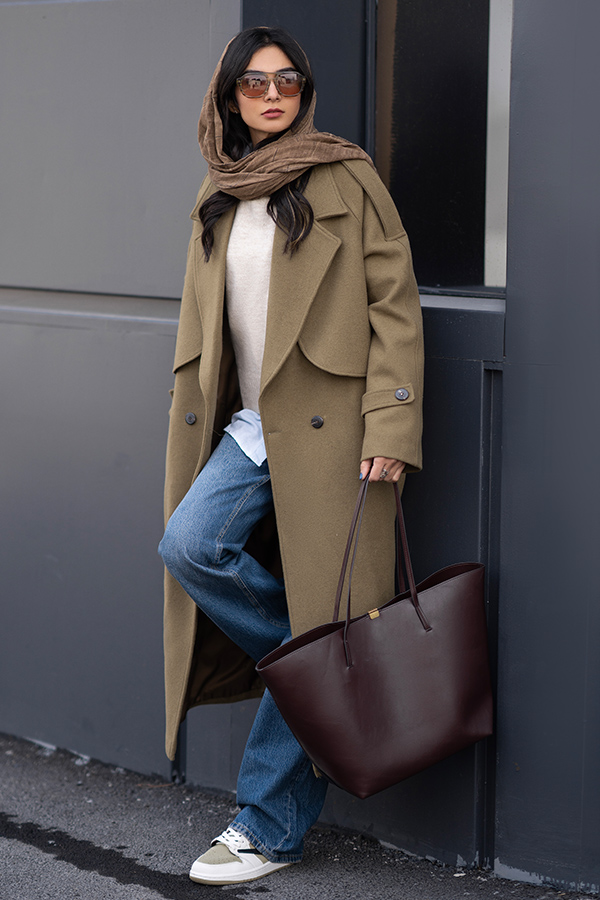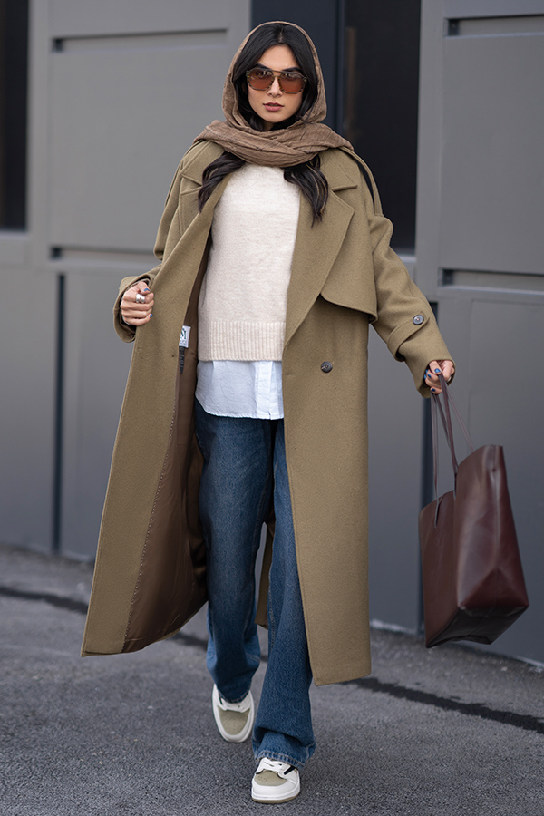 مدل پالتو: طرح ترنچ کت، یقه بزرگ، جلیقه دو طرف پالتو ، آستین رگلان ، یک چاک پشت پالتو